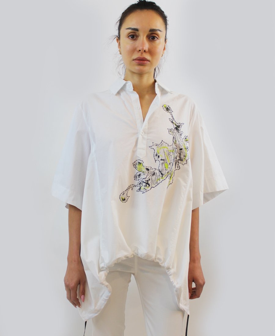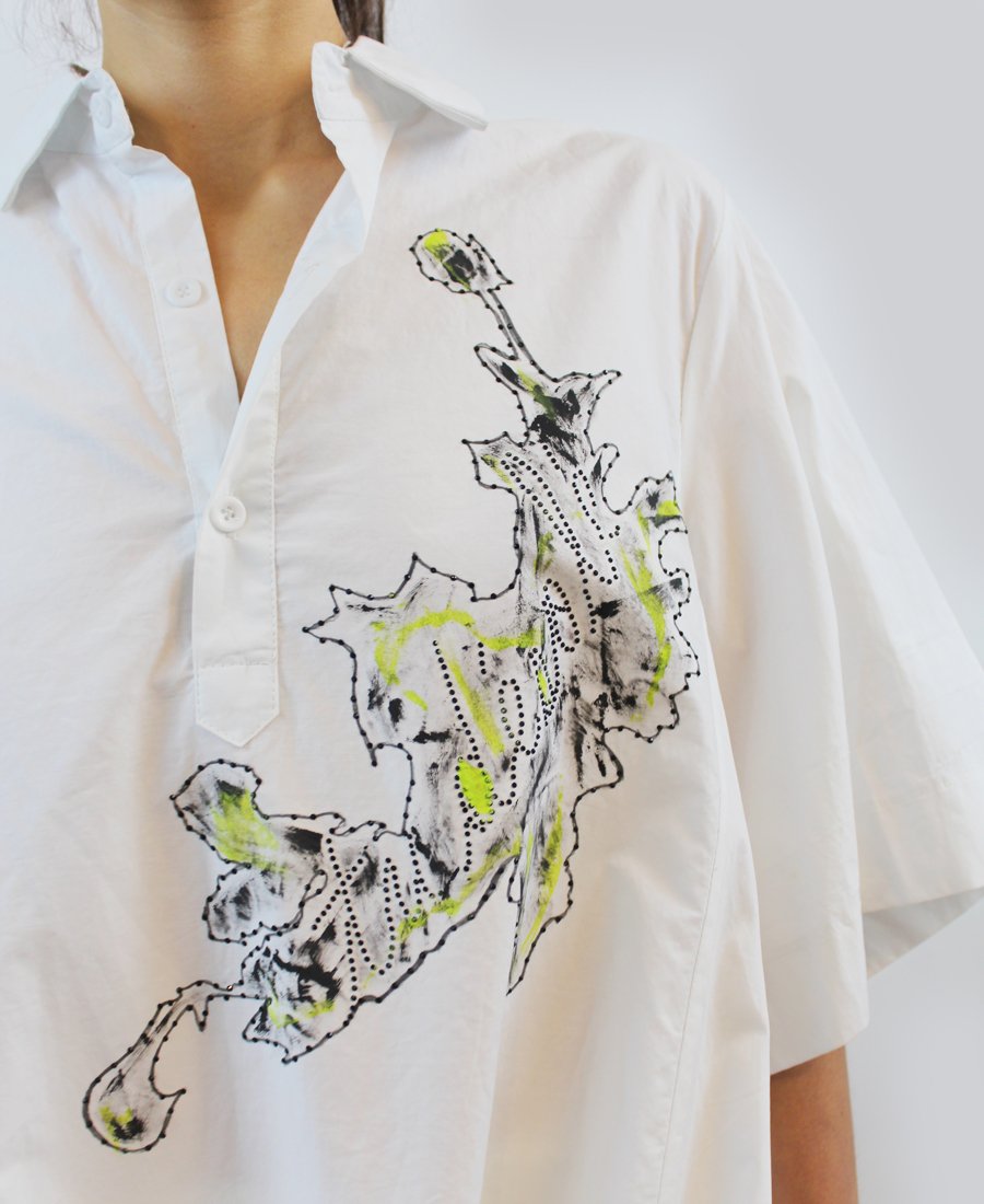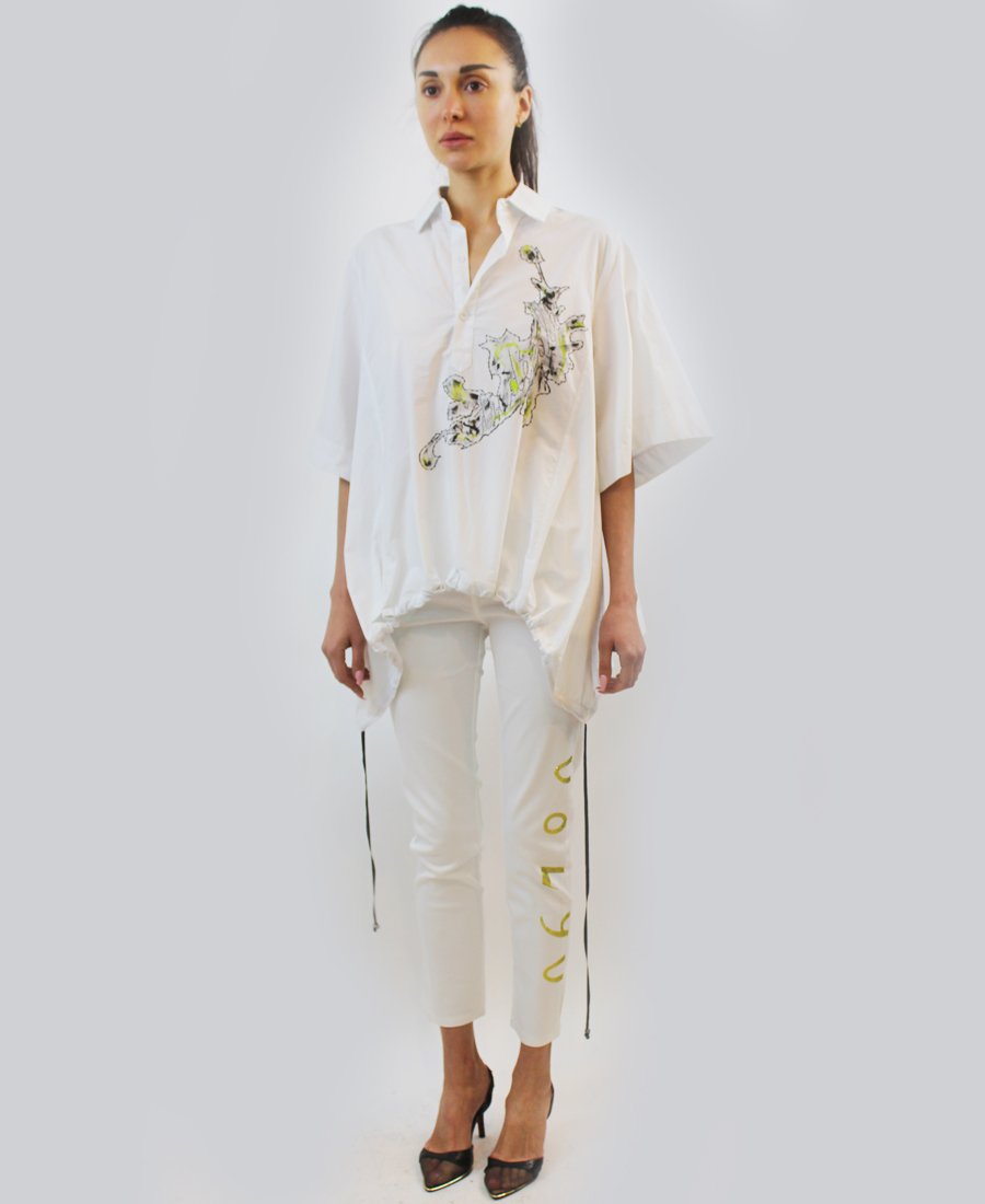 White blouse with green and black patch with script wording. A statement piece to have in your closet.