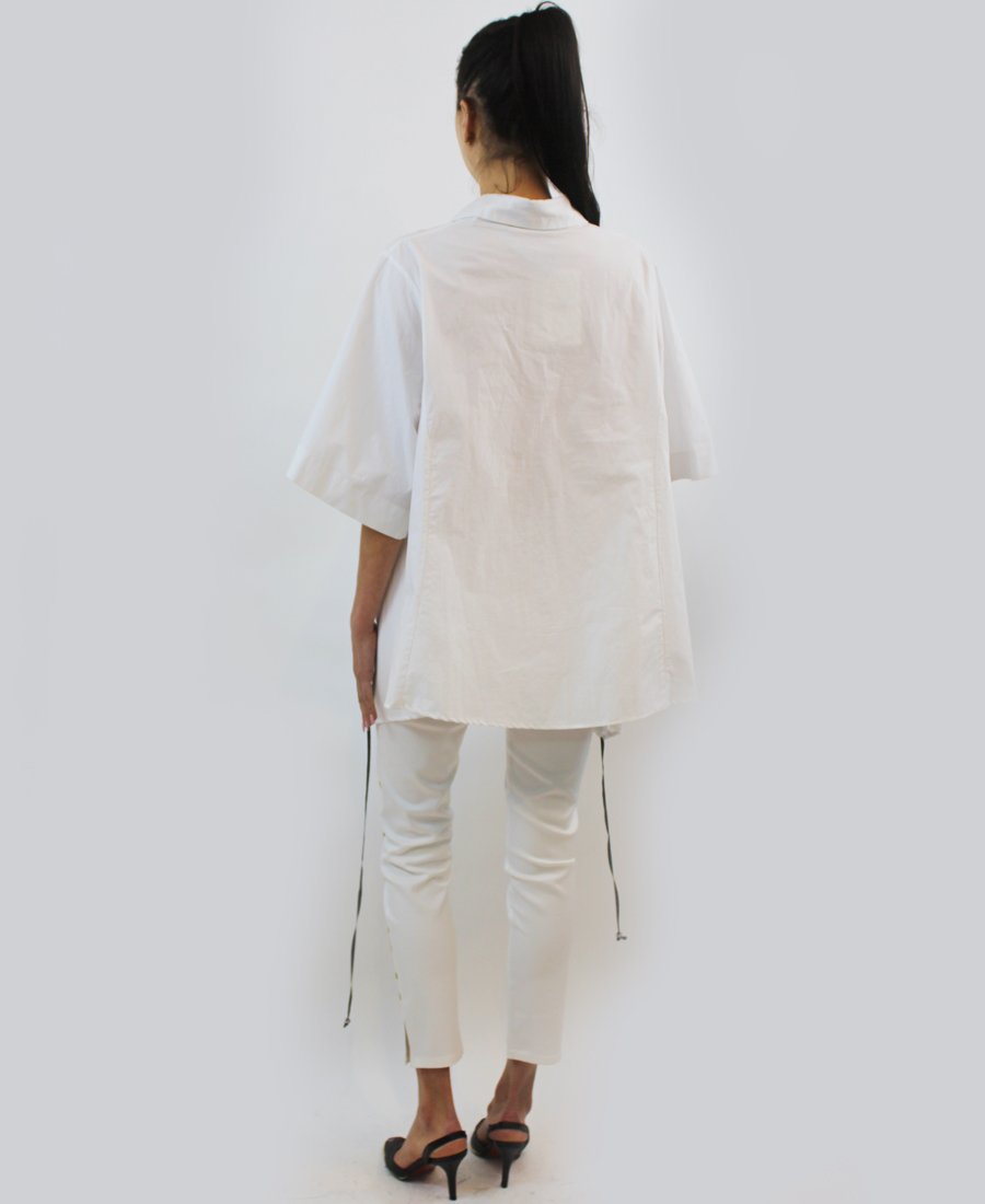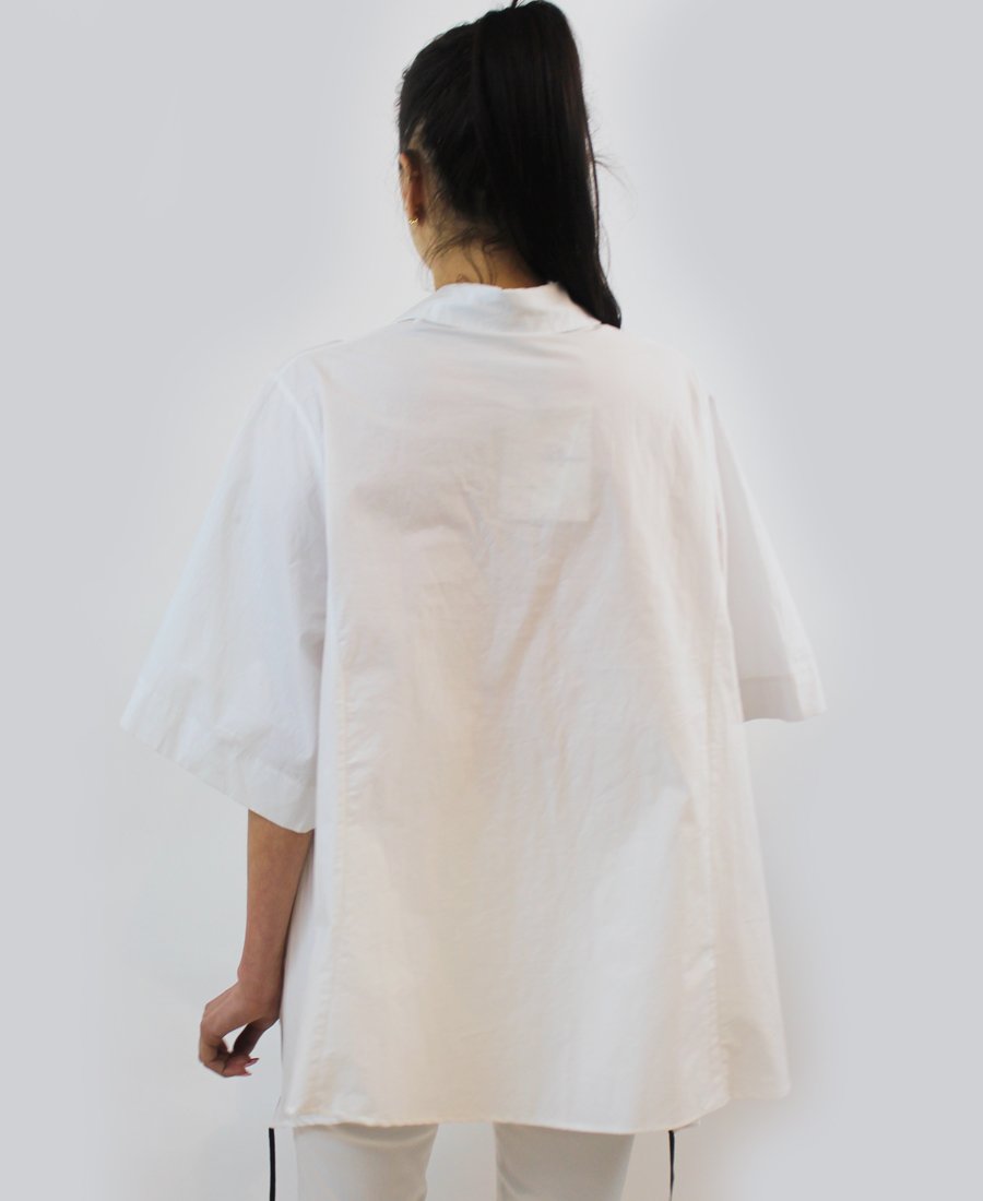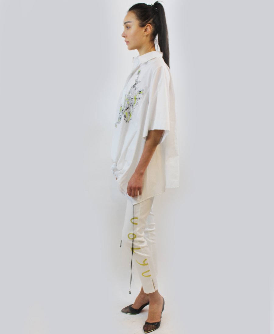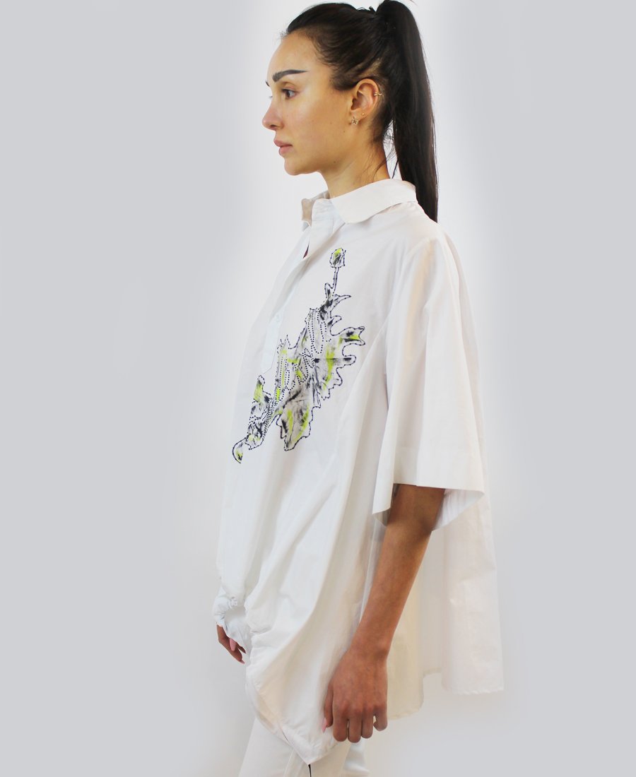 White blouse with green and black patch with script wording. A statement piece to have in your closet.