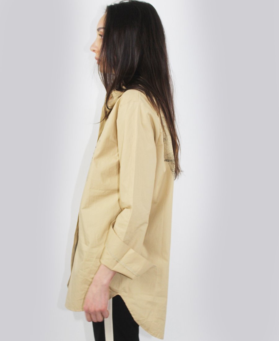 Pointed collar; seven-button placket. Long sleeves with buttoned cuffs.  Soft, medium-weight cotton. Relaxed fit through body. Shirt hits below waist