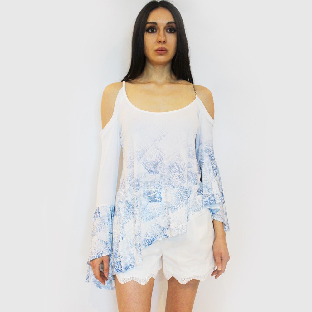 This on-trend cold-shoulder top features bell sleeves and a gorgeous blue & white print fabric.