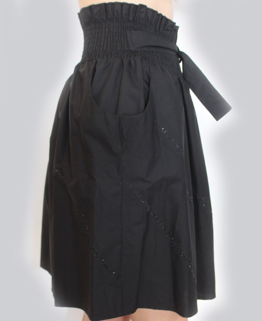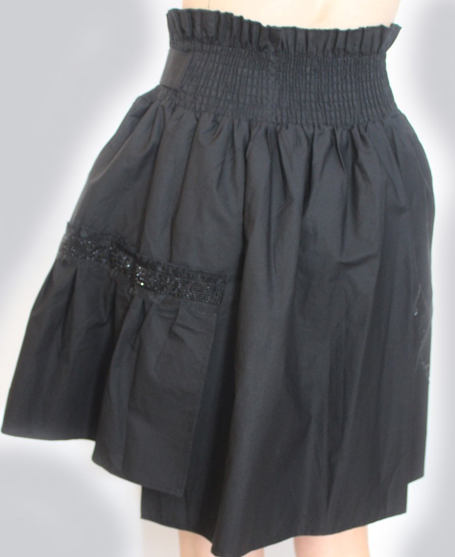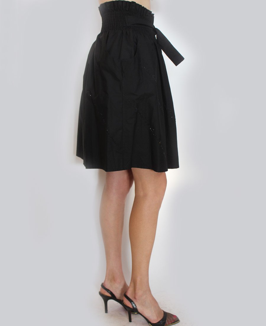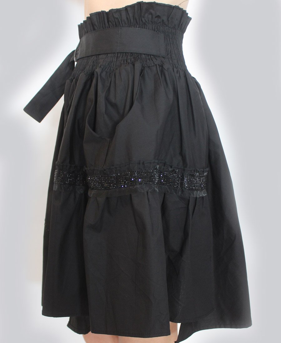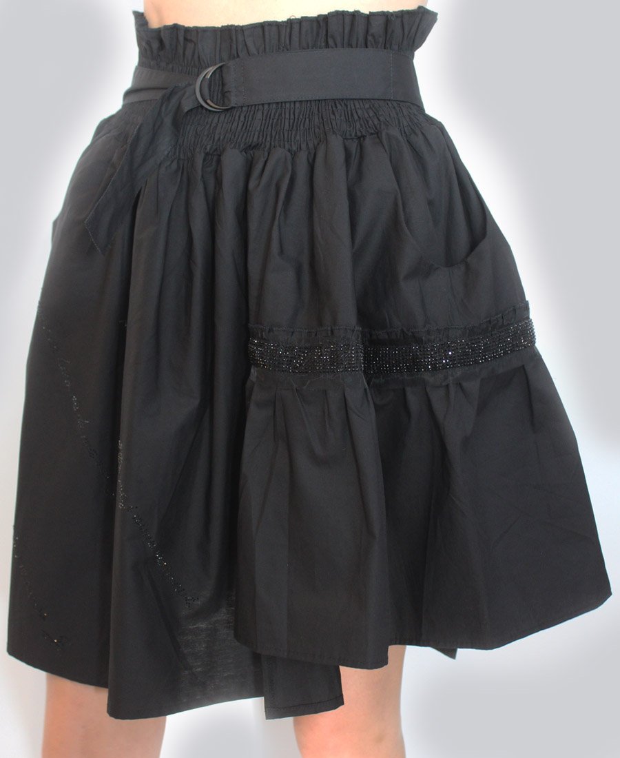 This stunning skirt features double pockets and an elastic waist with tie belt. The gorgeous French script beaded trim adds a touch of sparkle for day or night!