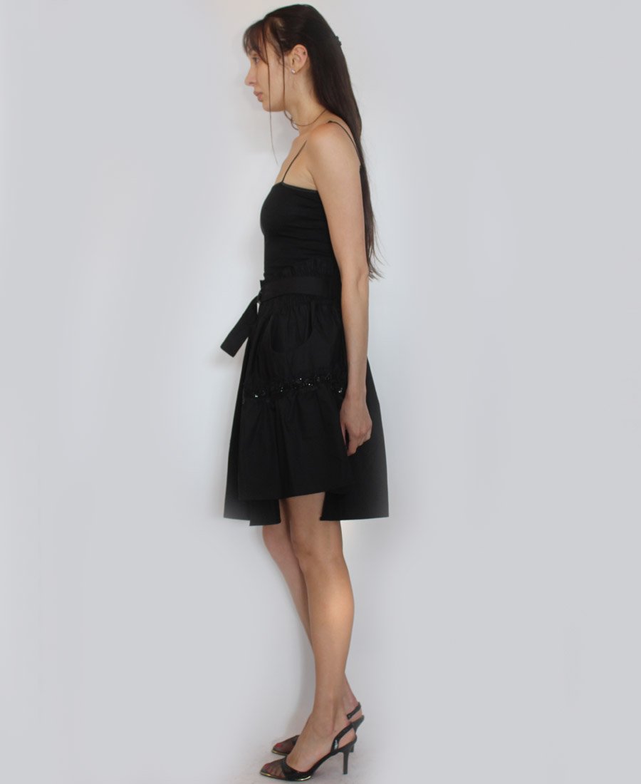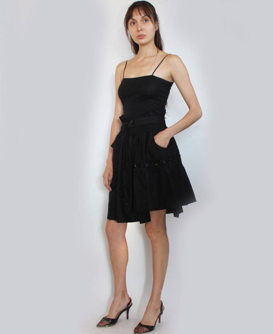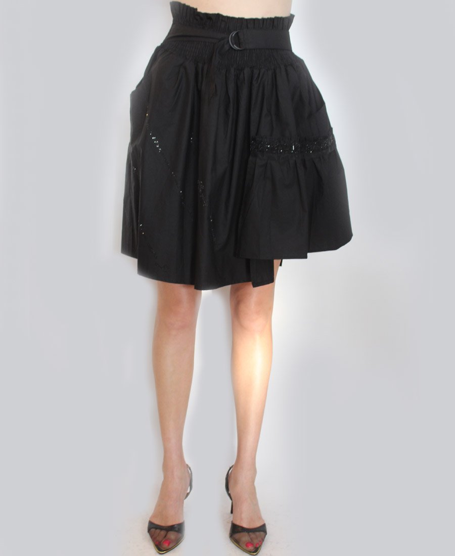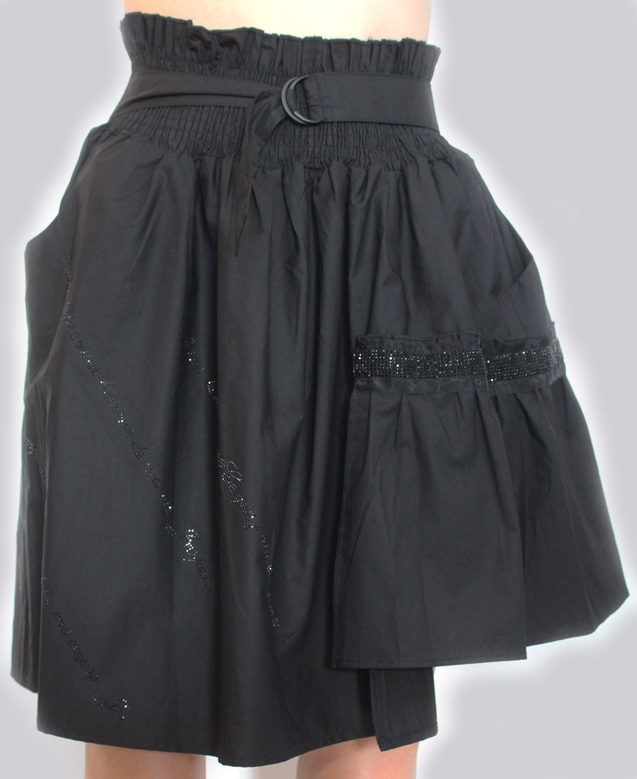 This stunning skirt features double pockets and an elastic waist with tie belt. The gorgeous French script beaded trim adds a touch of sparkle for day or night!