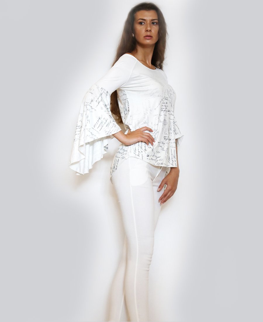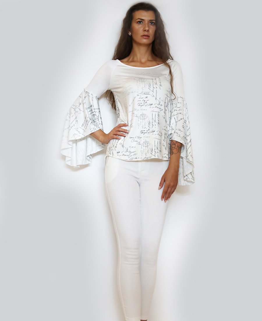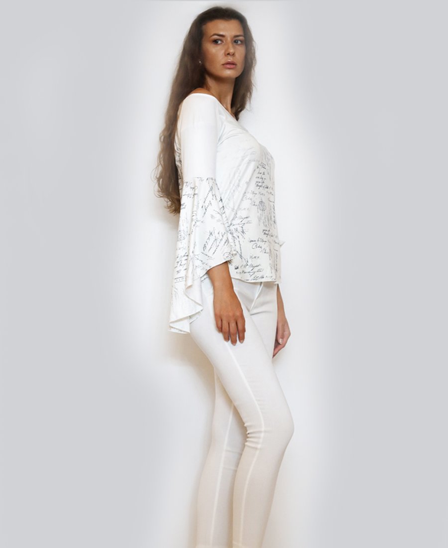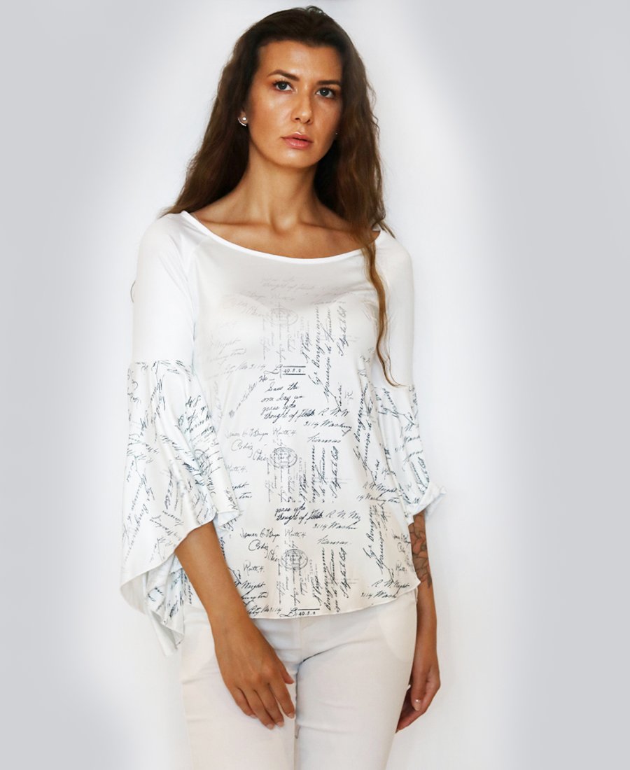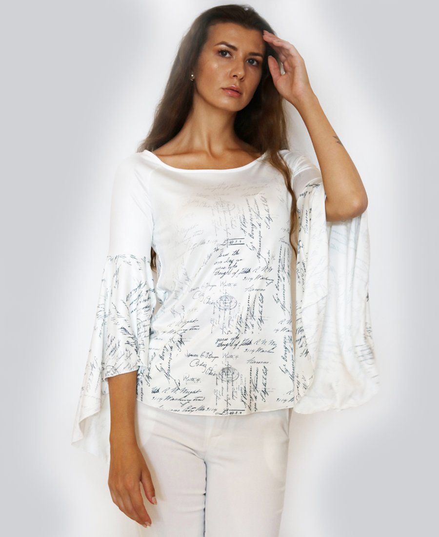 A fun and flirty top with large cascading sleeves and a writing print fabric.
