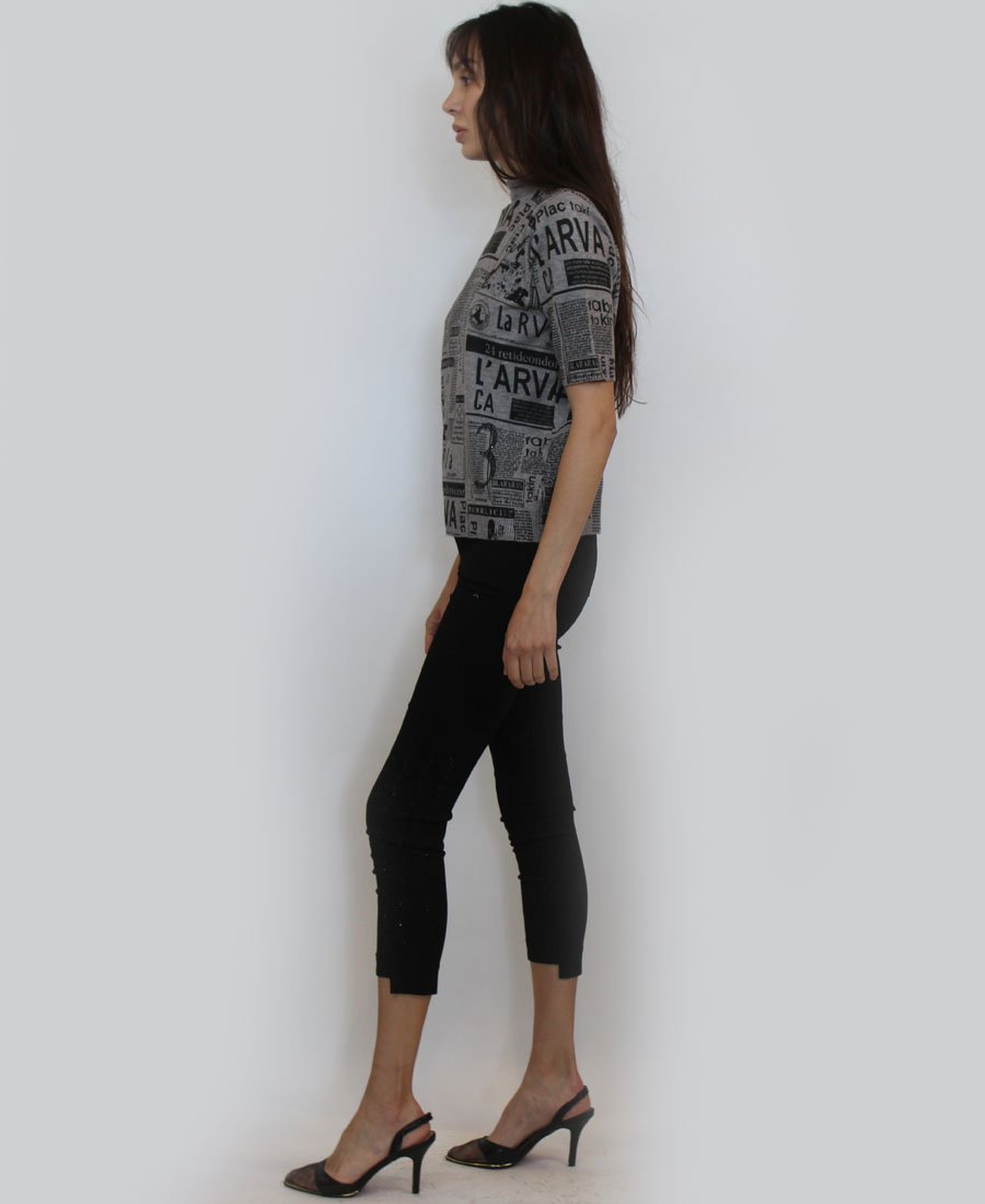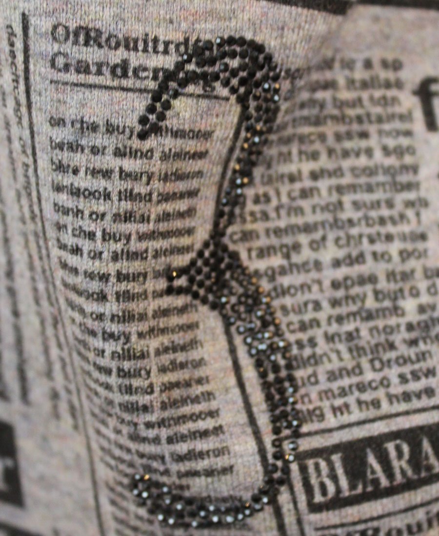 This fashion-forward sweater features 3/4 sleeves and an eye-catching all over newspaper print design!