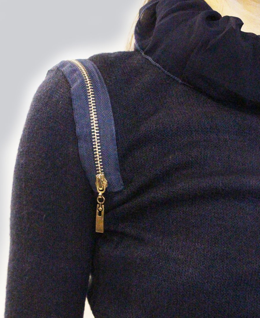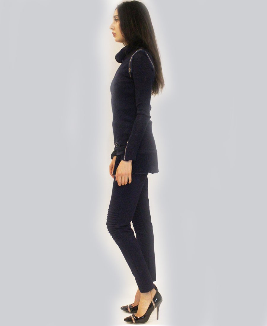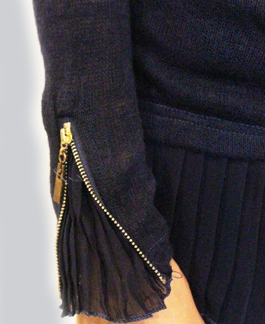 Turn heads in this form-fitting pleated fabric & zipper trim sweater!