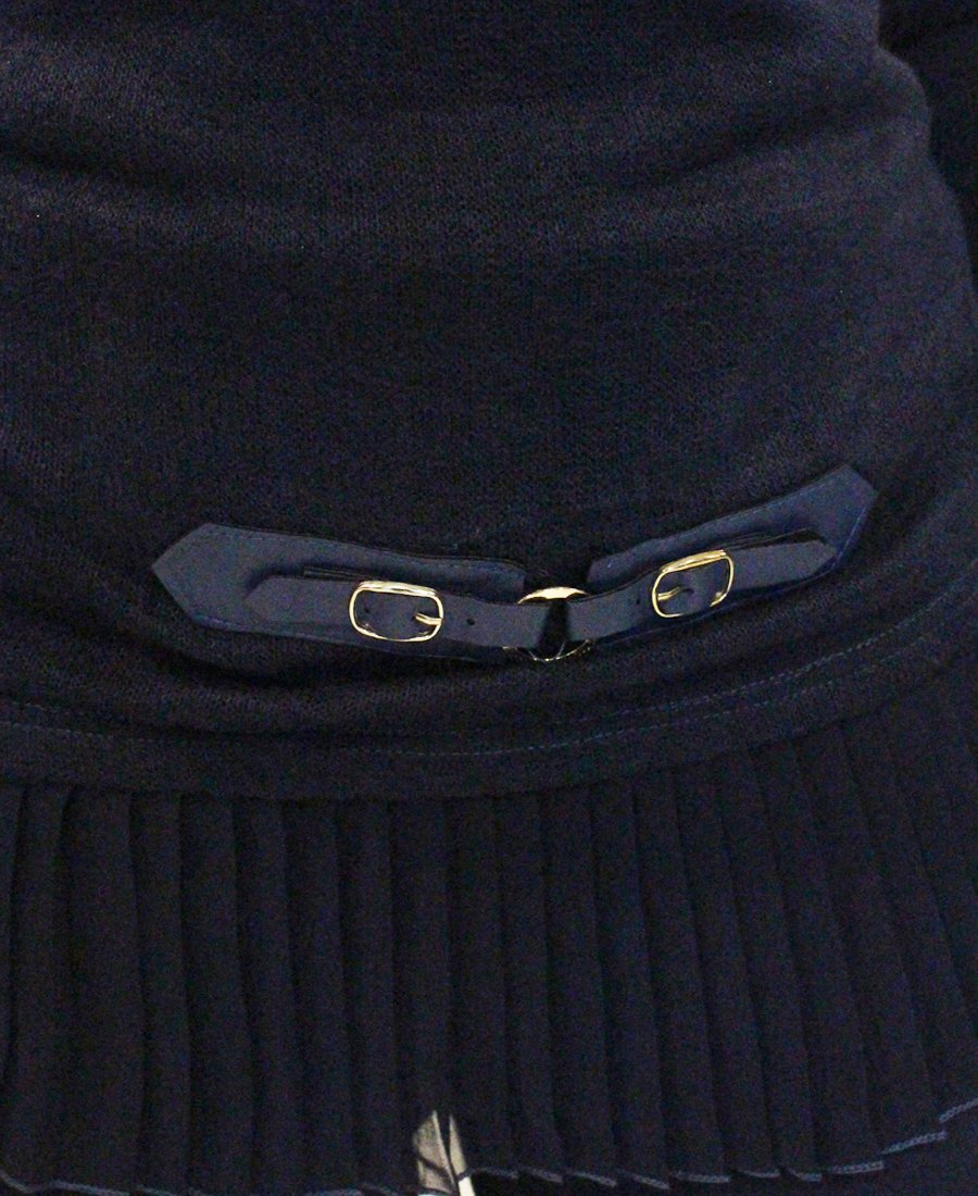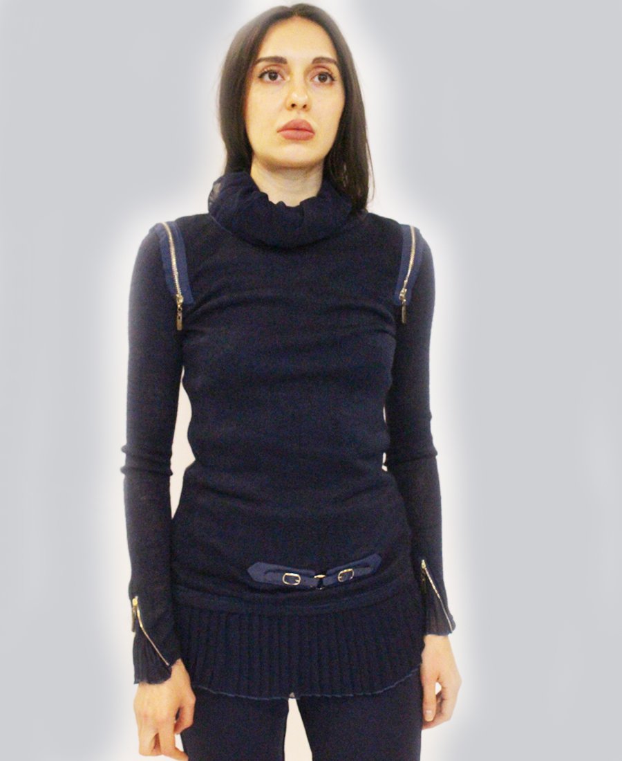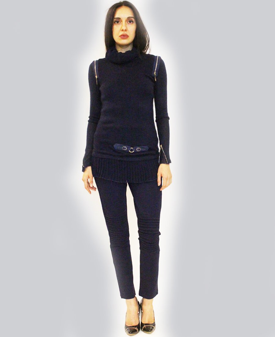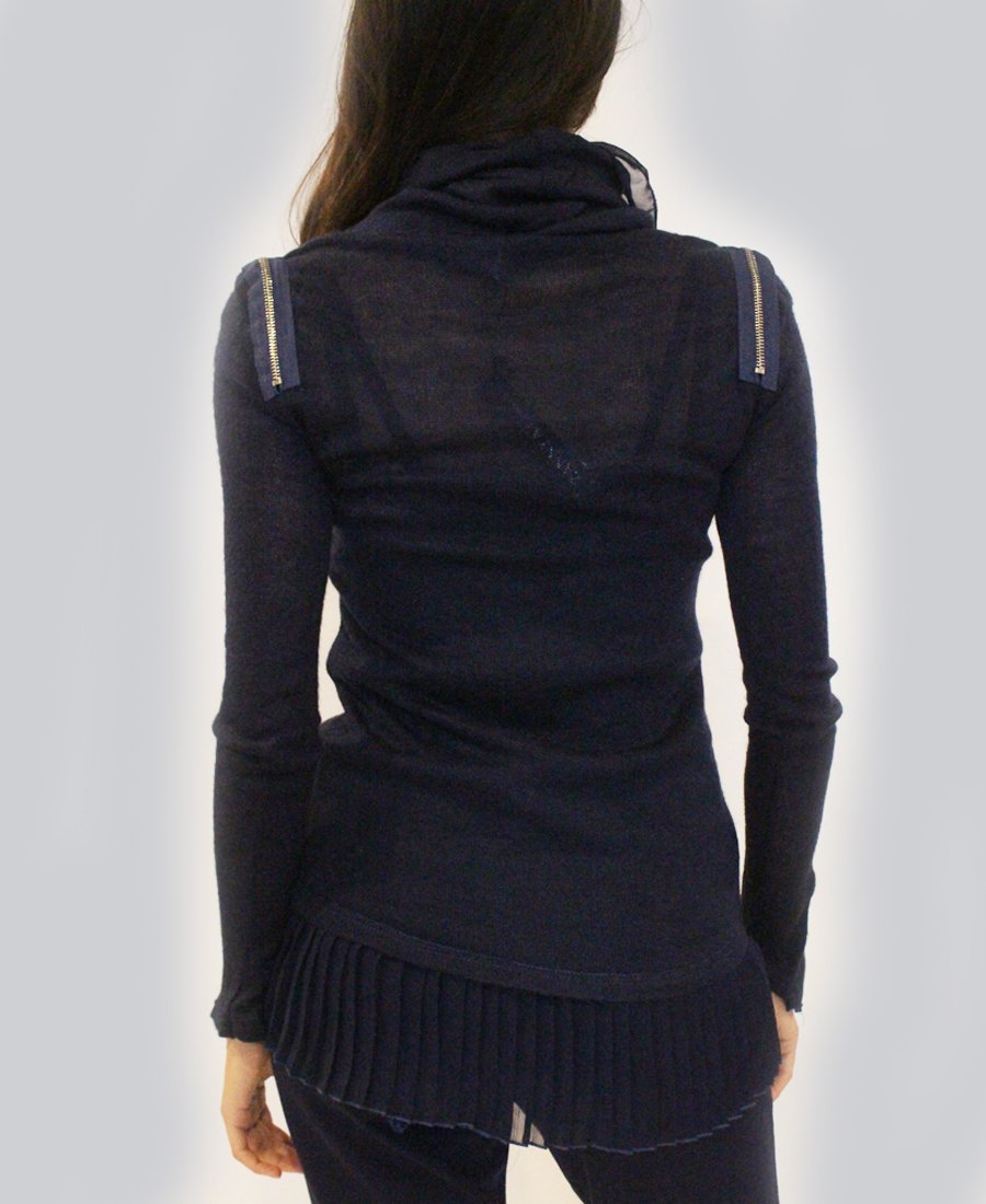 Turn heads in this form-fitting pleated fabric & zipper trim sweater!