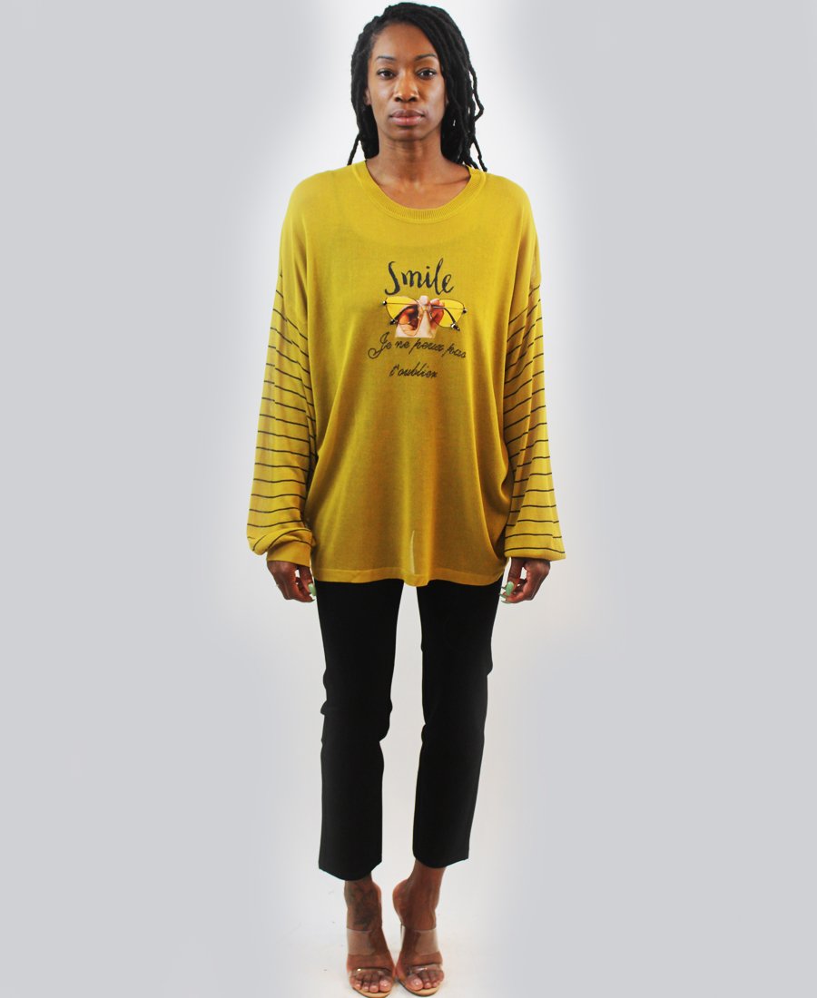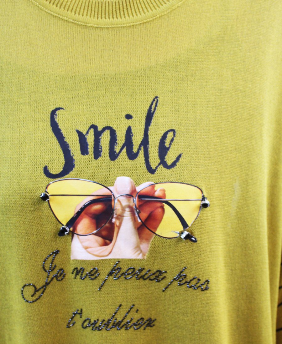 Cleanly designed and lightweight in a fine-gauge knit. Smile Sunglasses print. This sweater is one you’ll reach for again and again.