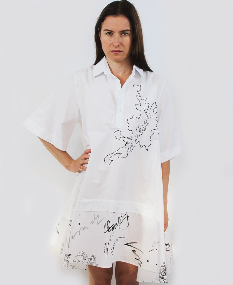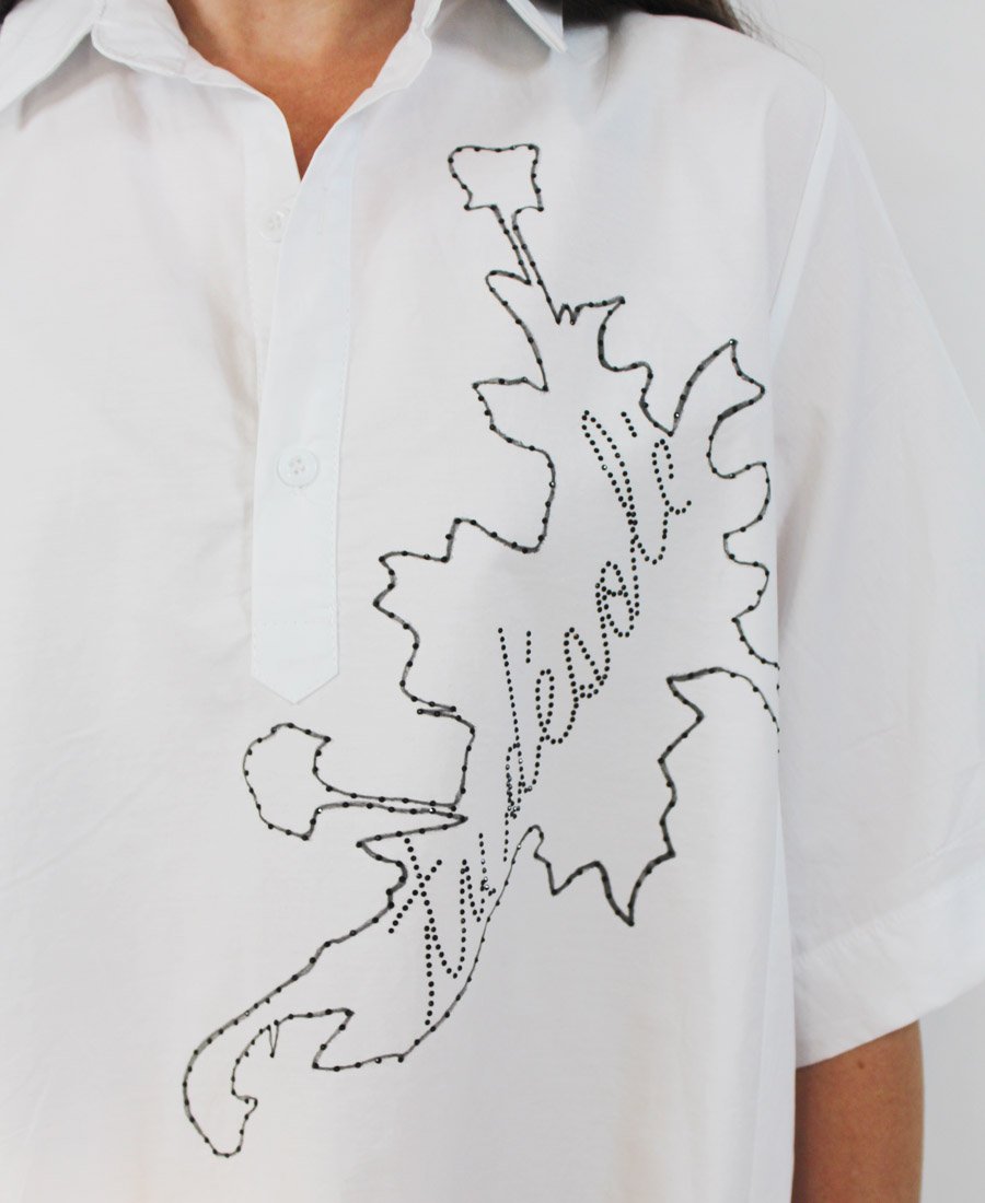 This three-quarter button dress includes a beautiful pattern on the bottom and hand-crafted beading on the top. A must have this season!