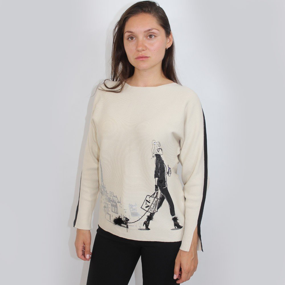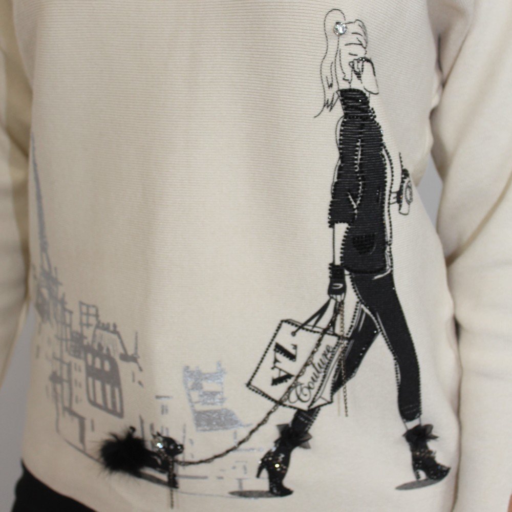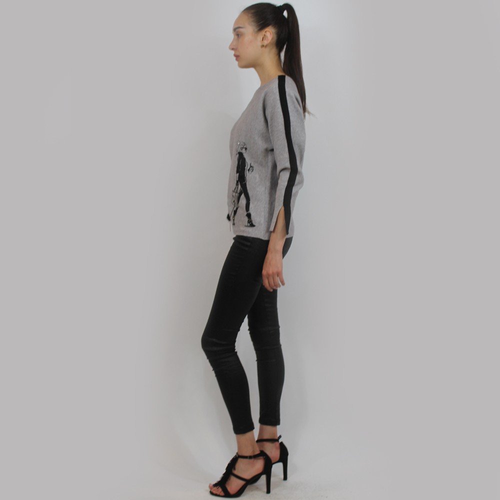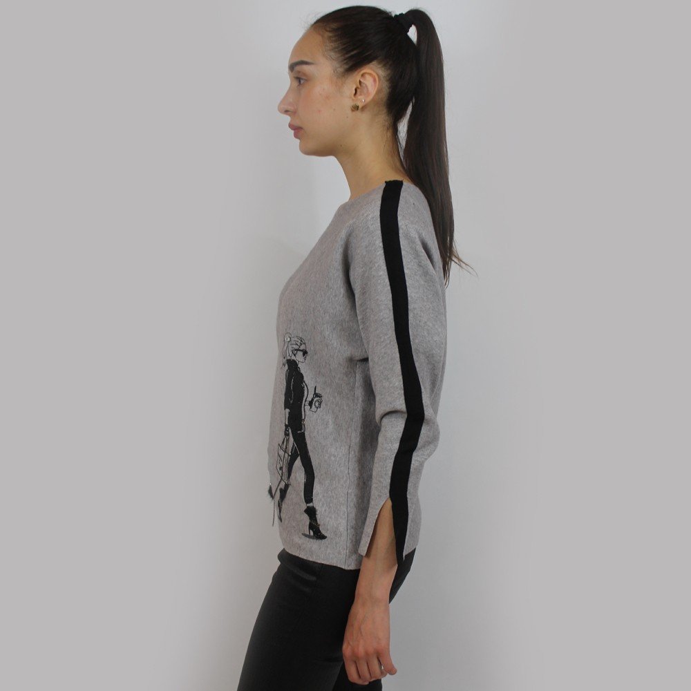 Trendy sweater features “walking girl” graphic. Super cute for everyday wear.