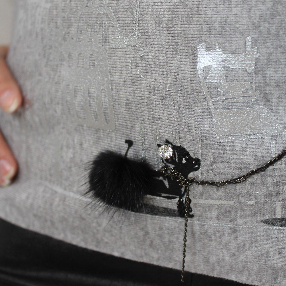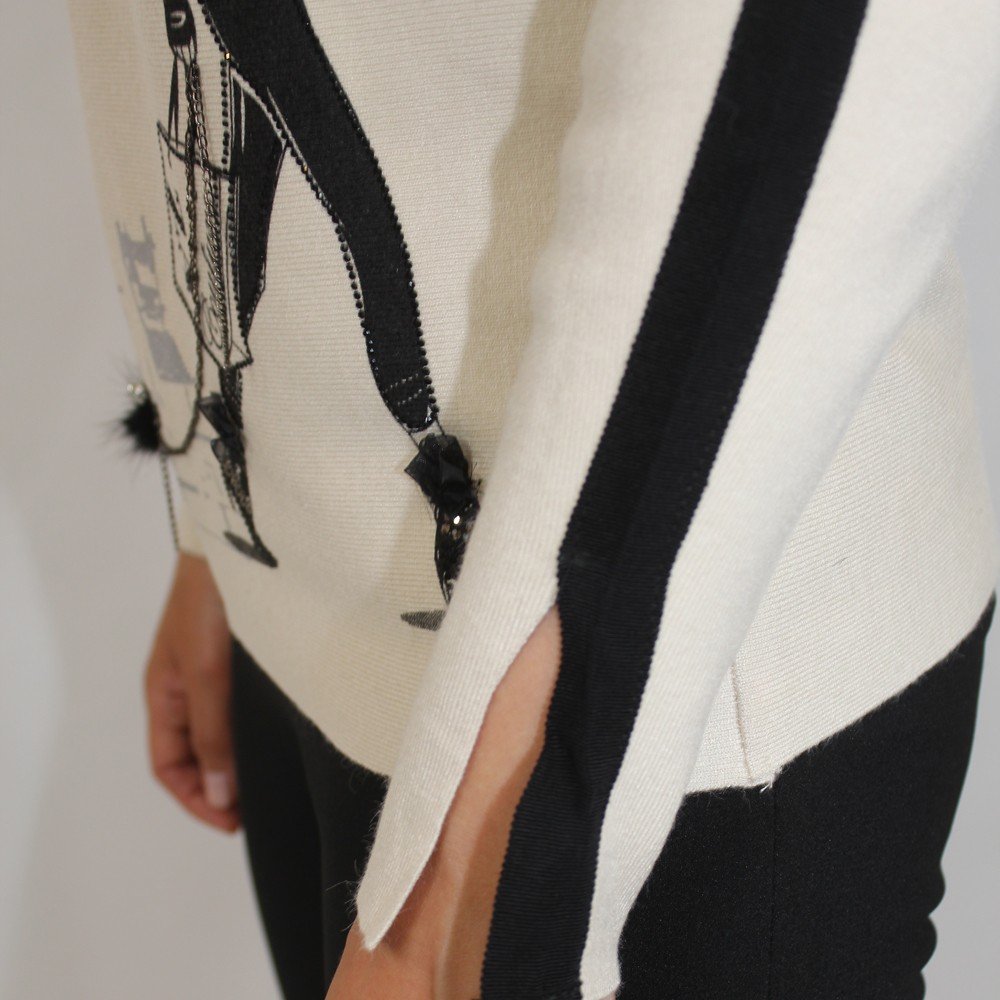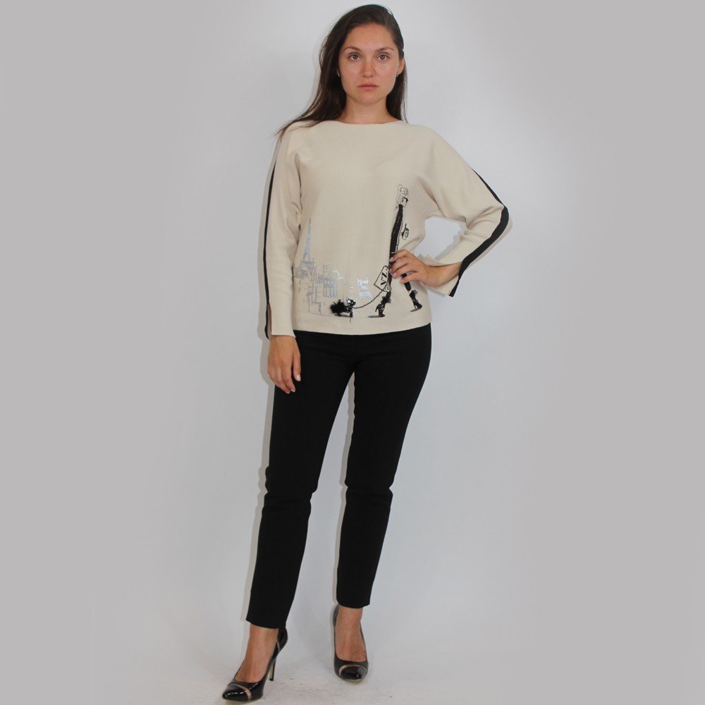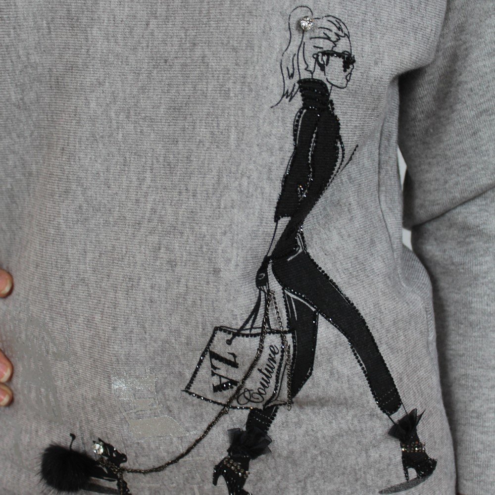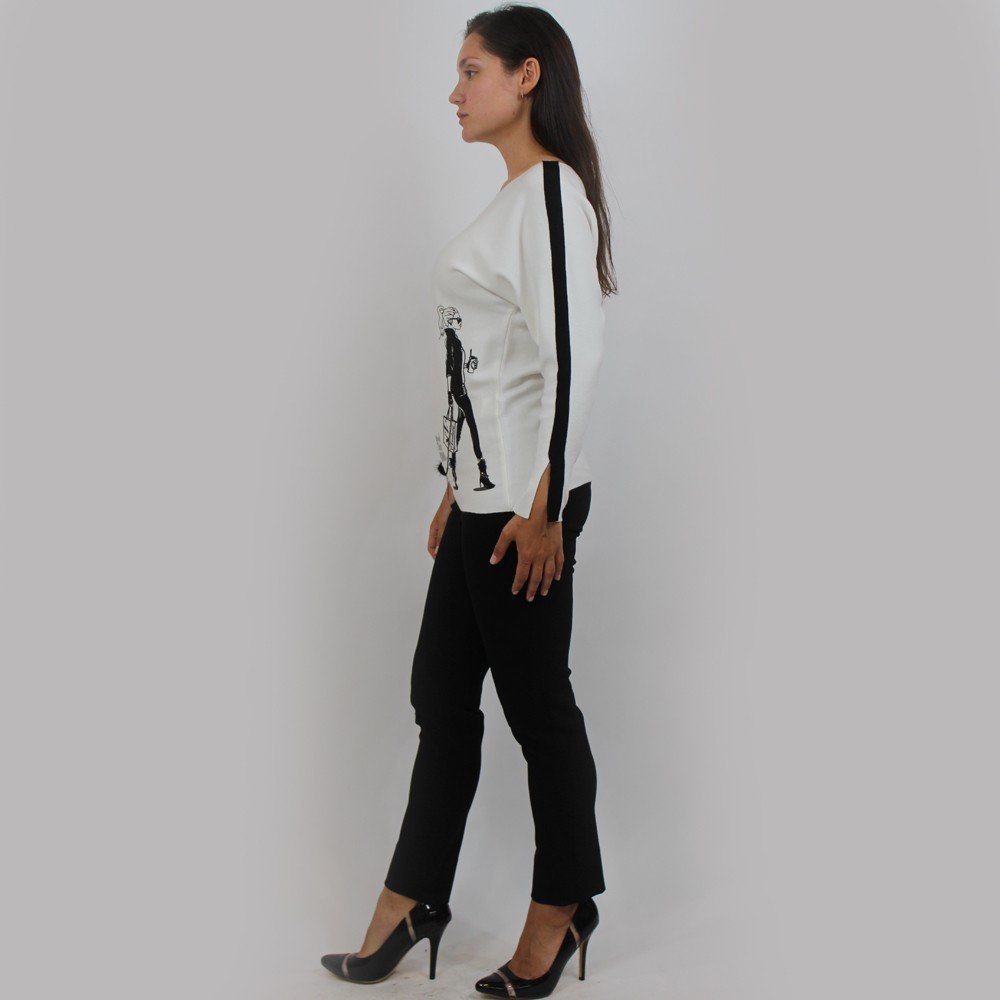 Trendy sweater features “walking girl” graphic. Super cute for everyday wear.