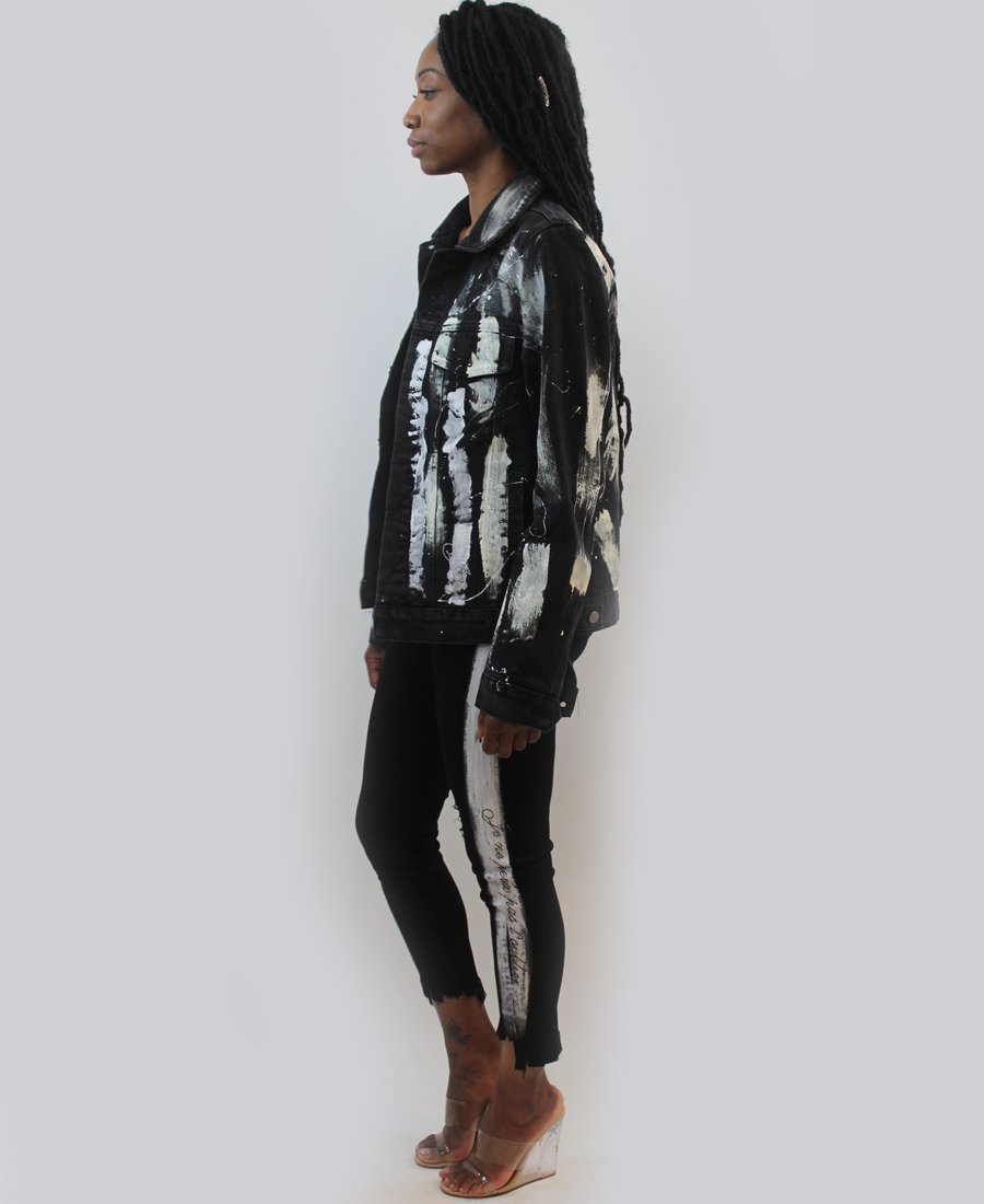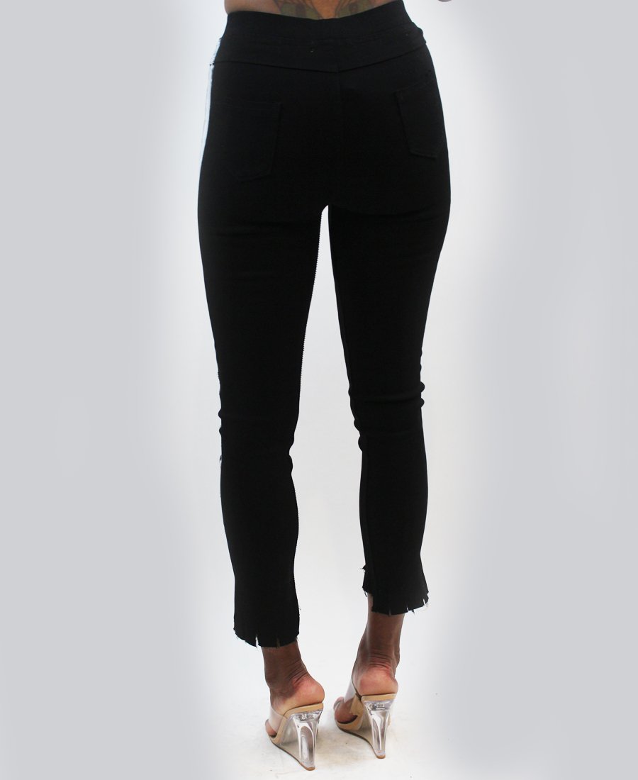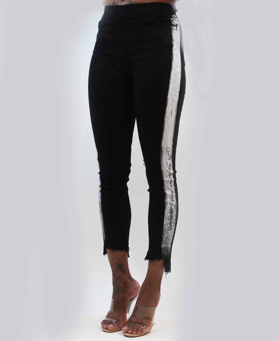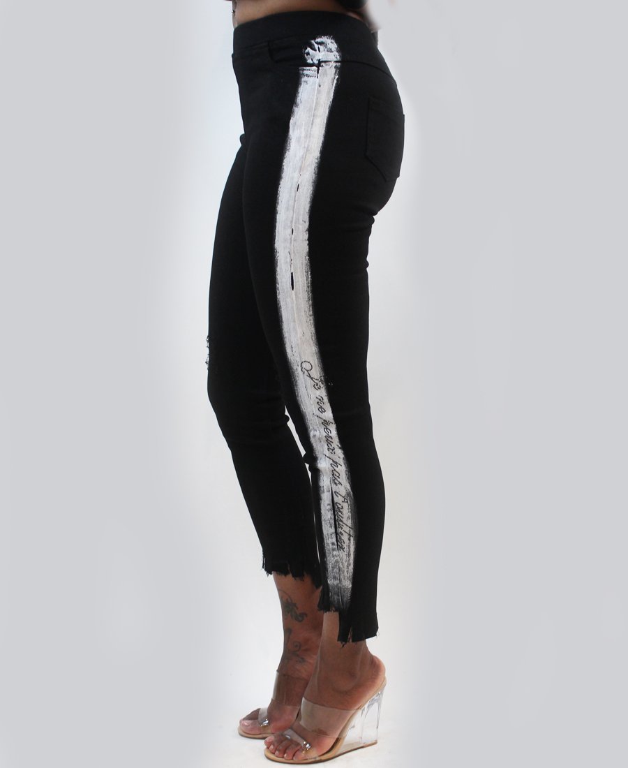Bored of plain black pants? Well the white paint down the legs definitely spice up these elegant black pants. Add to your closet for a whole new look.
